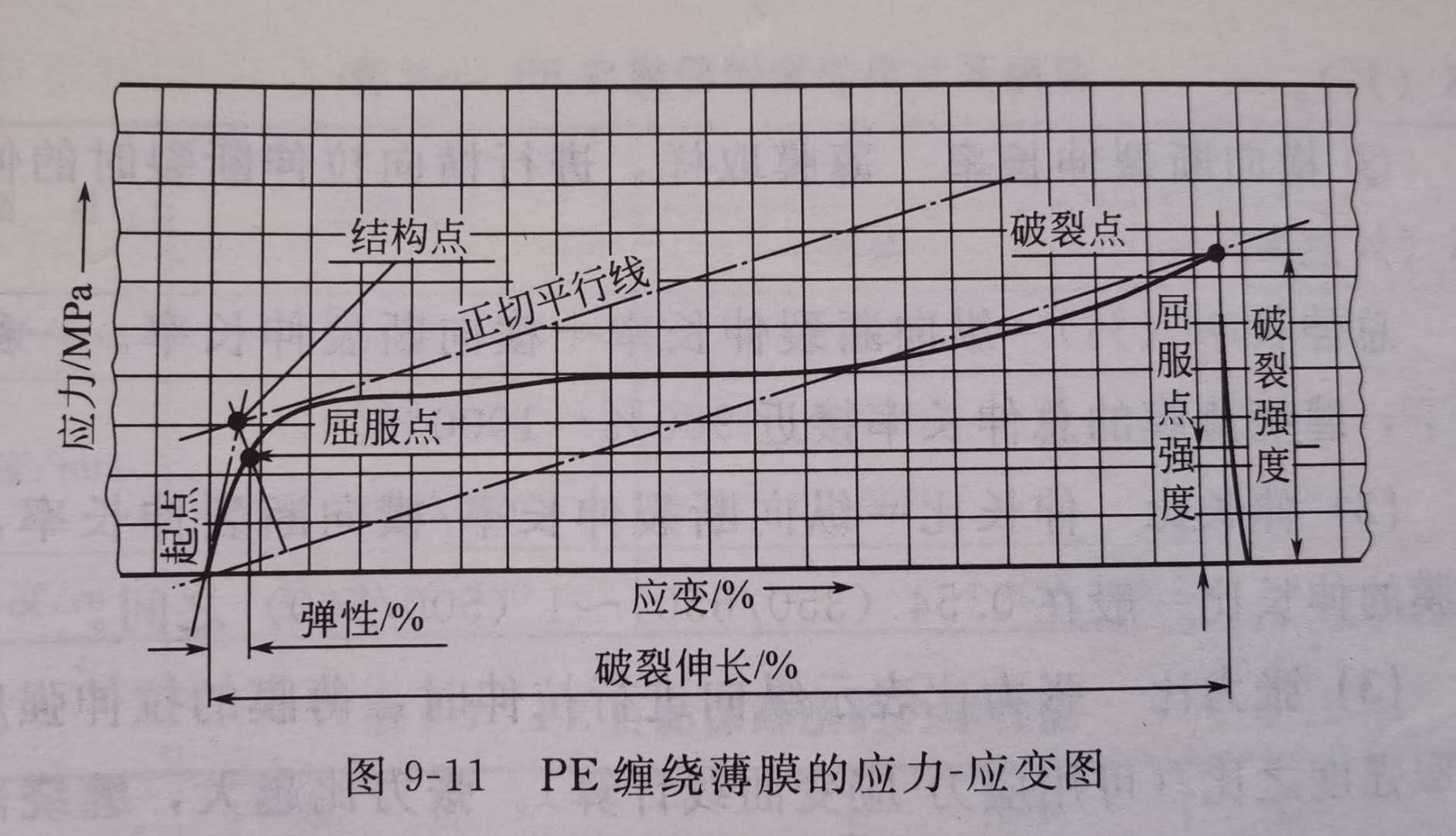 可借助於薄膜的應力-應變曲(qǔ)線,對於纏繞薄膜的性能進行簡單地分析。如圖9-11所示為pe纏(chán)繞膜的應(yīng)力-應變曲線圖。途中(zhōng)屈服點表示材料的彈性極限。在薄膜被拉伸時,負荷(hé)迅速增加,當超過屈服點時,薄膜發生(shēng)永久變形,在這個塑性範圍內,應力-應變曲線大體(tǐ)上是平直的,最(zuì)後,拉伸負荷繼續增(zēng)加,直(zhí)至達到破裂點為止。www.xbbg.cn流延薄膜製(zhì)造設備