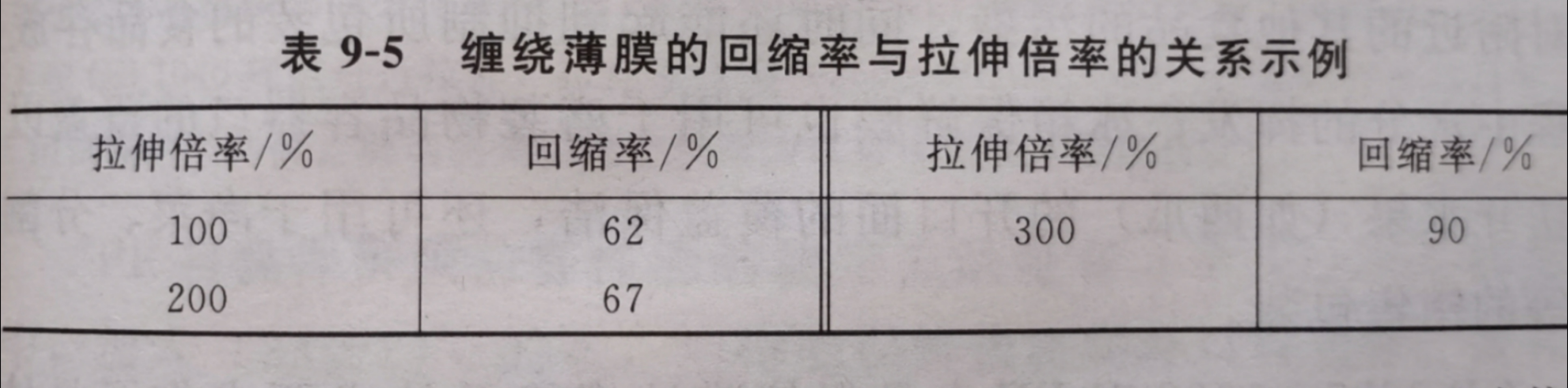 用纏繞薄膜包裹貨物時,纏繞薄膜(mó)在接觸貨物前一般預先進行拉伸,使薄膜包裹(guǒ)貨物之前,受到一個恒定(dìng)的拉伸力並使該拉伸力(lì)均勻地(dì)分布在(zài)薄膜的整個寬麵上,其預拉伸(shēn)率可達200%-300%。預拉(lā)伸使薄膜強度提高,耐常溫蠕變能力也大(dà)大提高;纏繞薄膜除有好的拉伸性能之外,還具有很好的拉伸回縮記憶性能。記憶性能使(shǐ)高分子材料的一個特性:熱收縮膜受熱(rè)狀態下恢(huī)複(fù)記憶產生回(huí)縮;二纏繞膜在常溫下(xià)經預(yù)拉伸,可產生彈性回縮功能並通過彈性回縮功能把包裝物緊緊(jǐn)包裹起來。纏繞薄膜(mó)拉伸時的回縮率,因薄膜的生(shēng)產條件不同(特別是配方的不同)而不盡相同,但都隨拉伸倍率的增大而增大,纏繞薄膜拉伸時的回縮率示例見表9-5.