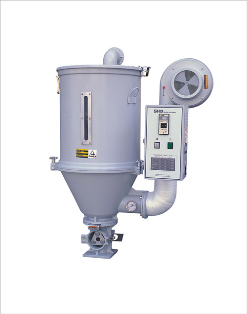 原料幹燥機的作用主要是清除原料中(zhōng)的水(shuǐ)分。獨立使用時,可(kě)用烘箱式幹燥裝置。幹燥機是專為擠(jǐ)出機生產配套用的料鬥(dòu)式幹燥機。該設(shè)備已(yǐ)有專業標準,應用時,可根據擠出機生產用料量大小,選取相匹配的規格(gé)。料(liào)鬥式幹(gàn)燥(zào)機的(de)工作方法是:開動風機,風機把經過電阻加熱的空氣由料(liào)鬥下(xià)部送入(rù)幹燥室,熱風在幹燥室內由下往上吹,當熱風在原料(liào)中通過時,把原料中的水分加熱蒸發(fā)帶出,則潮濕的熱(rè)氣流由幹燥室頂部排出。熱風連續地進出,把原料中的水分一點點蒸發帶出,達到幹燥原料的目(mù)的。